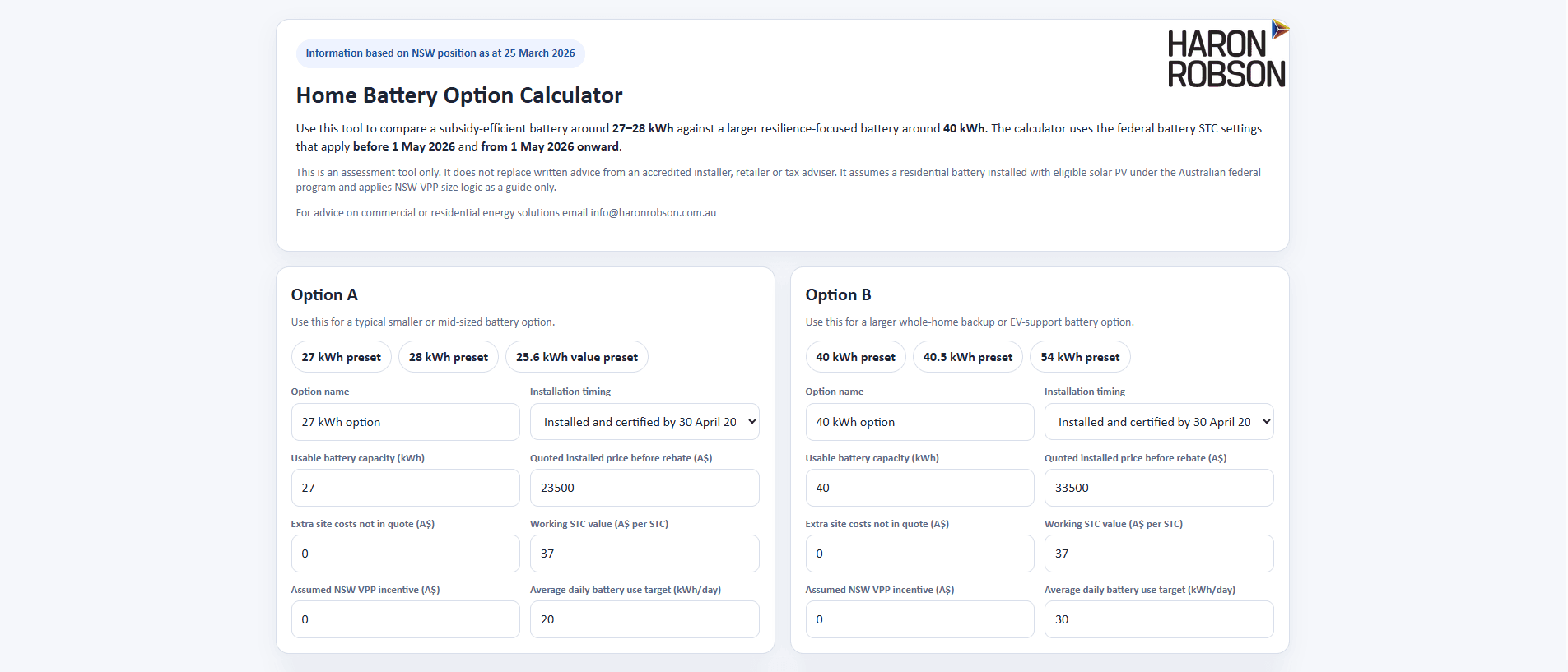 That is why I have put together a calculator that helps test the effect of battery size, timing, roof area for solar PV, orientation, shading, occupancy pattern, what will be powered by the battery, what will charge the battery, and whether the project is more likely to suit single-phase or three-phase supply.